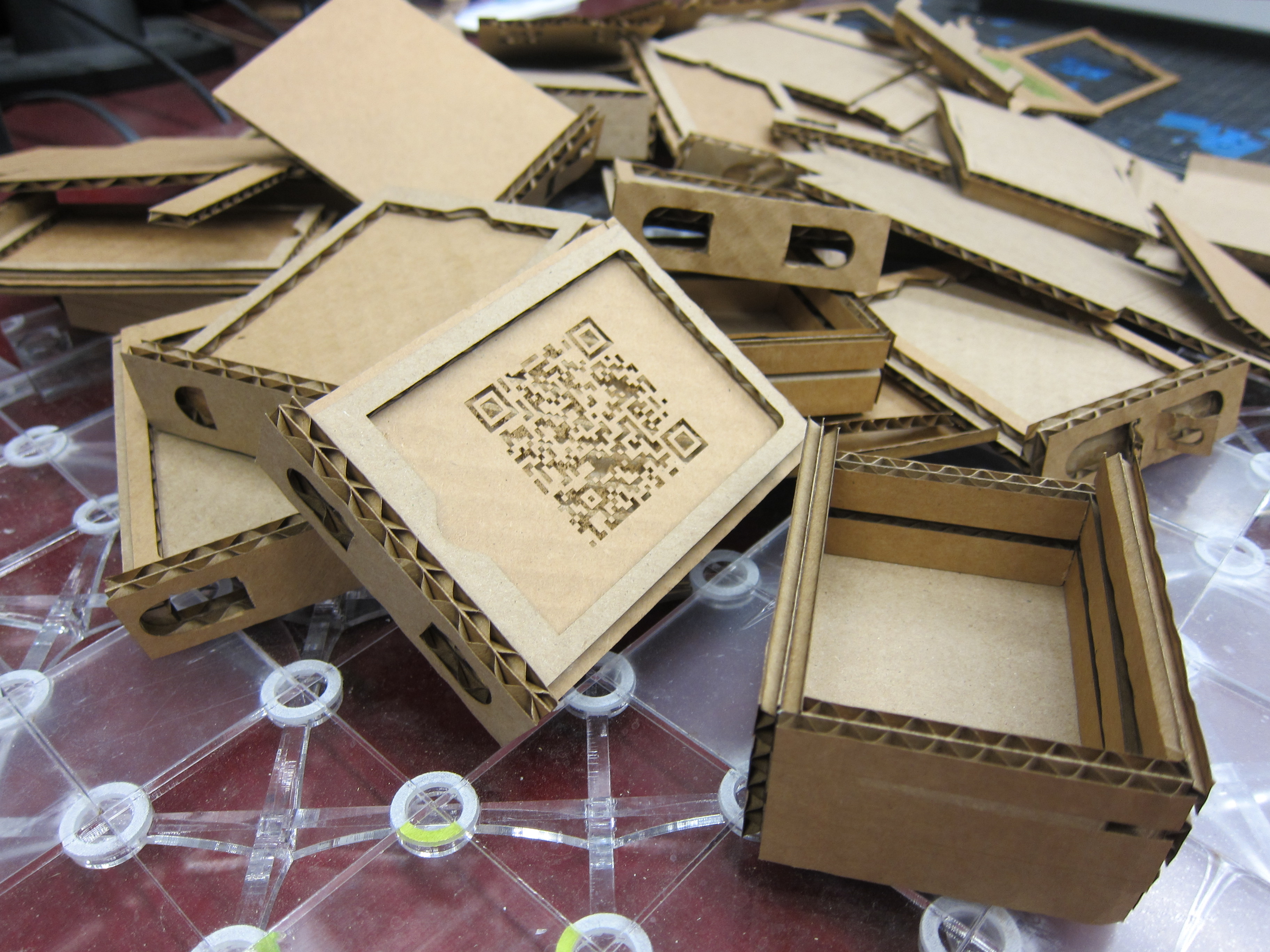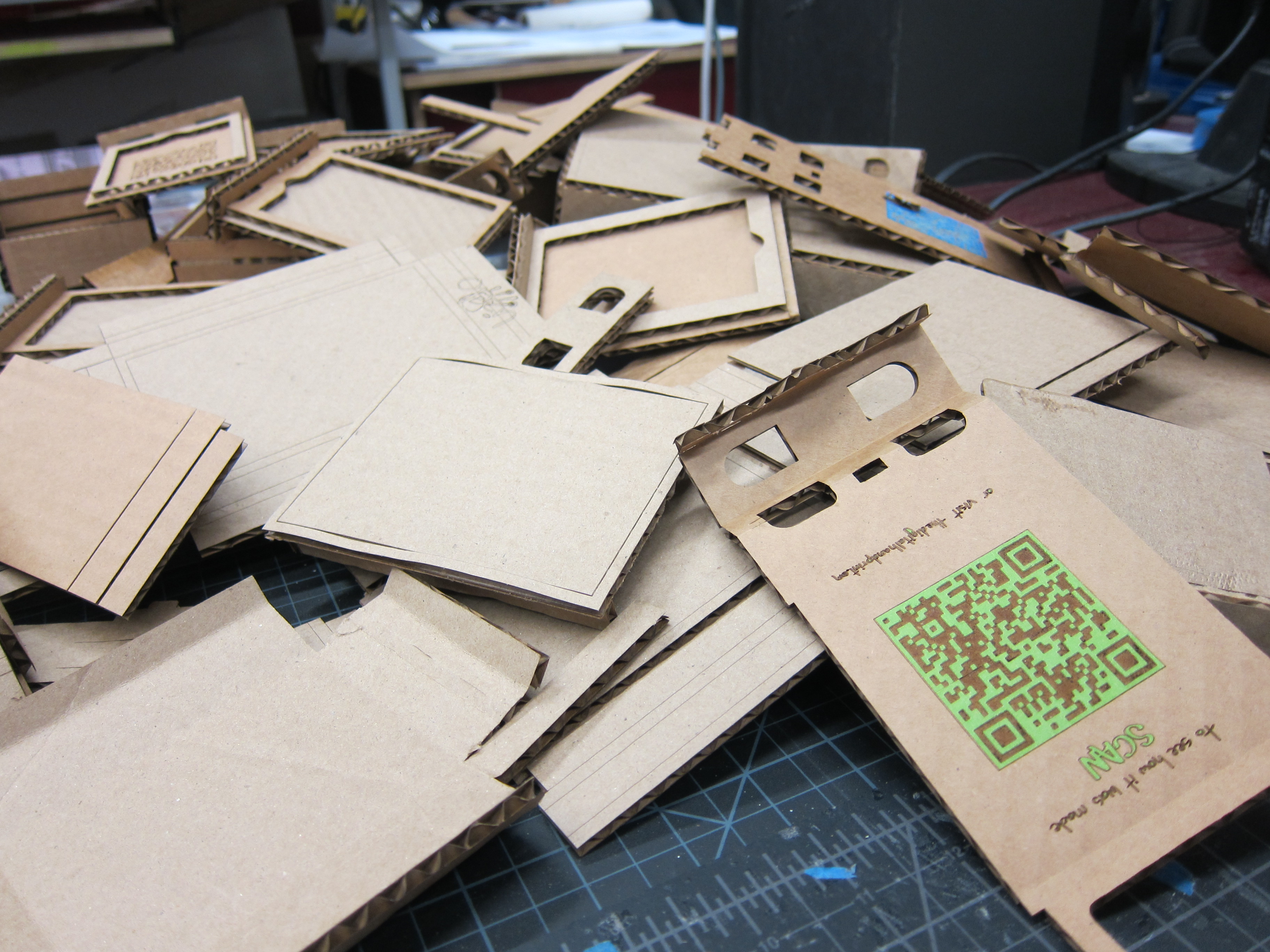 It only took a week and a tabletop brimming with prototypes but the super awesome perfect-as-I-can-get-it-without-going-insane box is finally done. Not only does it have an insert that holds the wallets but it also has a top-secret QR code underneath that directs all who scan it back to this blog so they can feast their eyes on all the cool photos (and videos) of it being produced. There was something really interesting about engraving a QR code onto the box that would show people how it was made. Like a self replicating machine. Cool stuff I say.