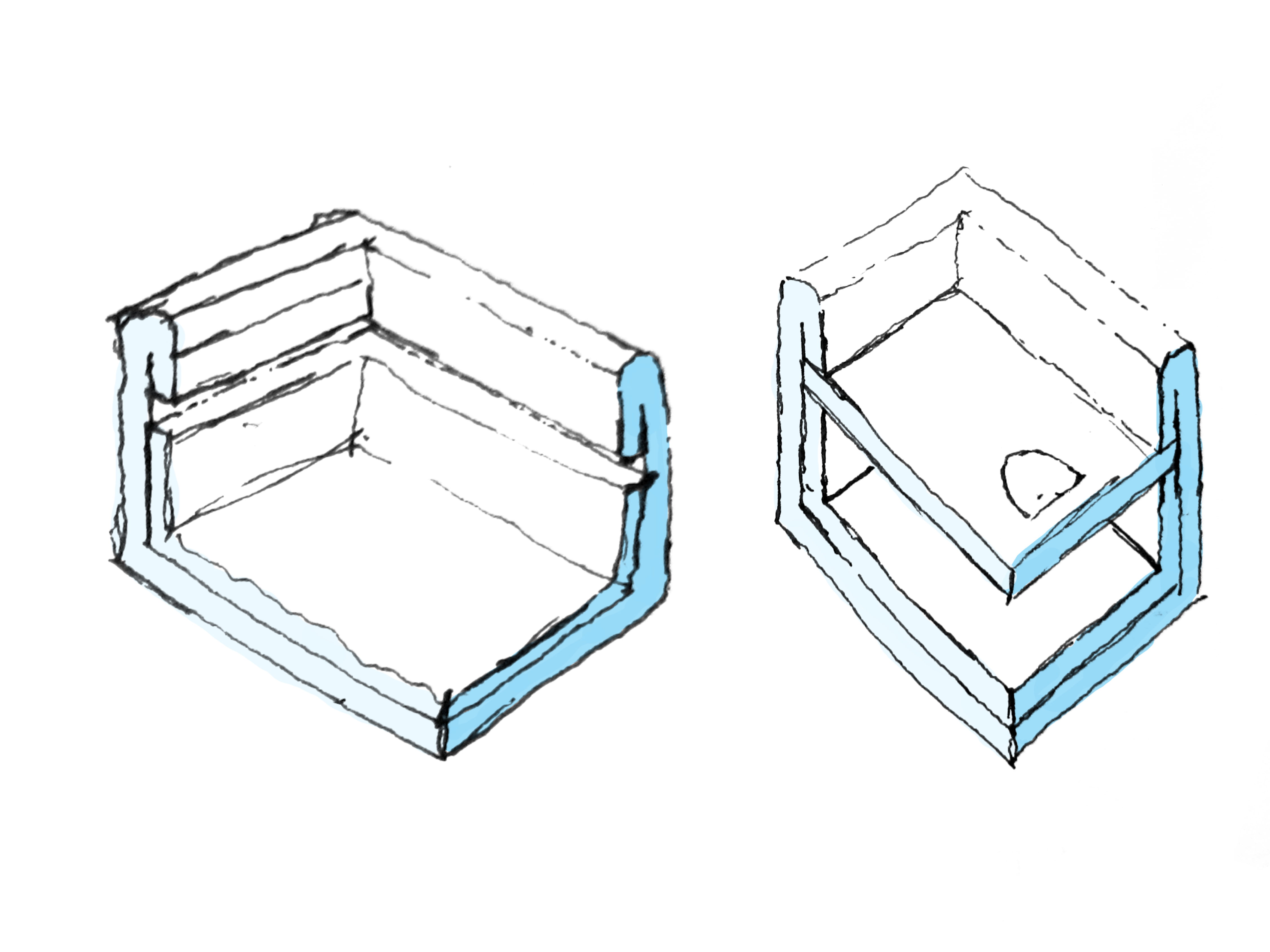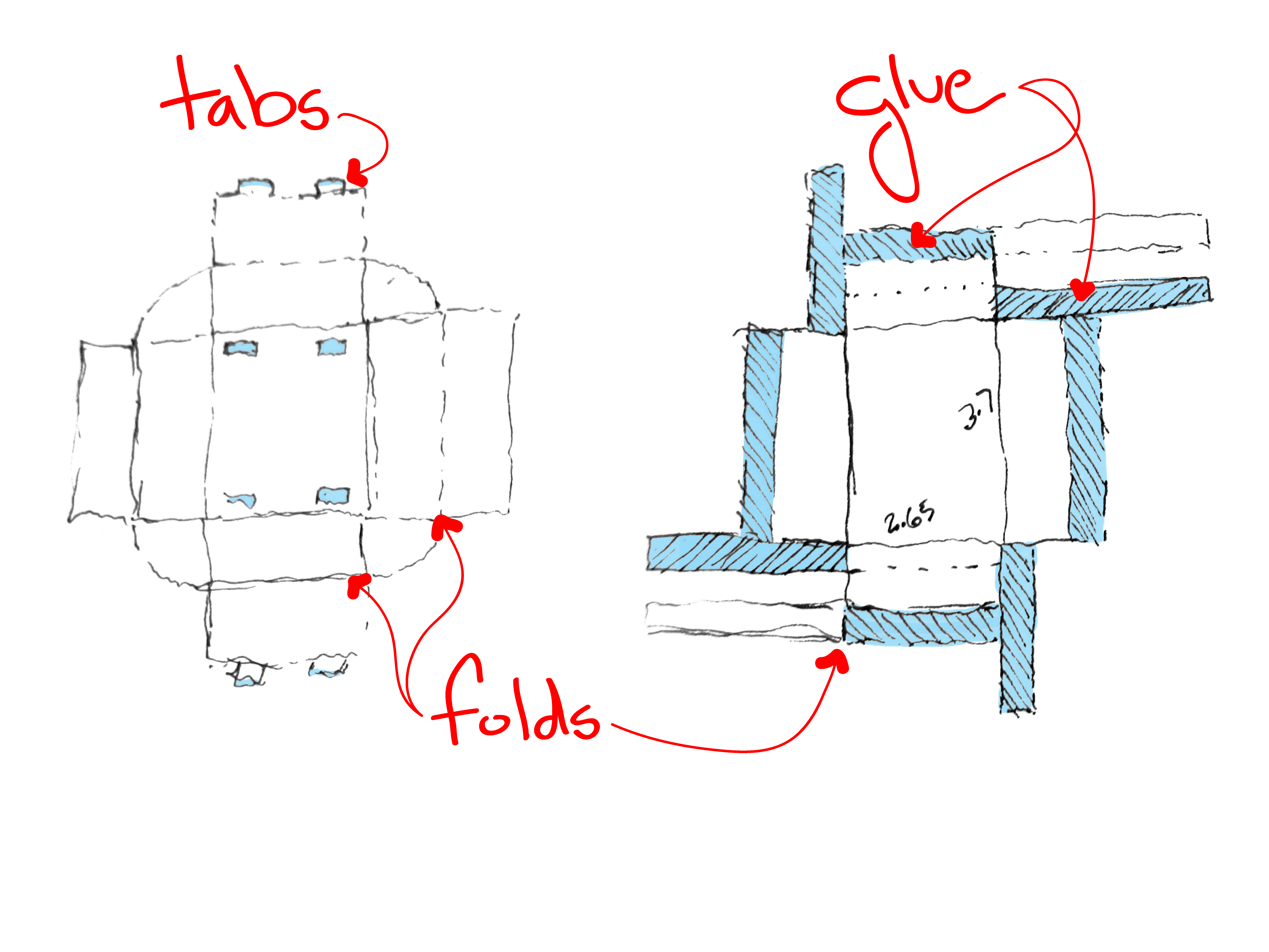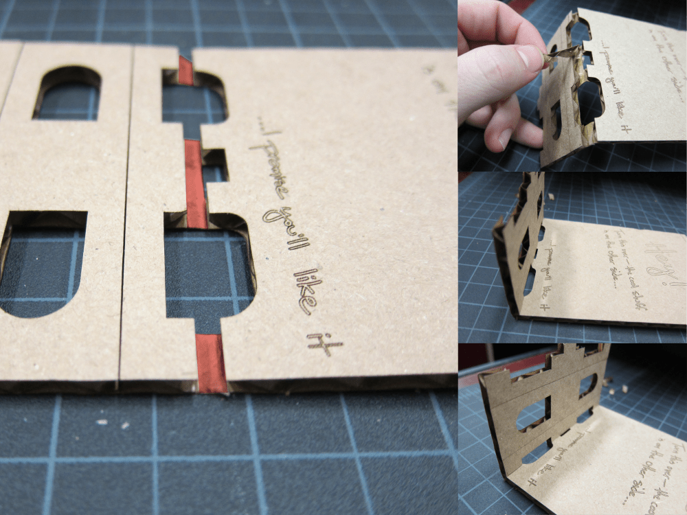 First a brief overview of the two folds I’ve been using, and then a few pictures to try to clear up the confusion I’ll have caused by the description. The basic 90-180 degree fold can be made by scoring the cardboard on one side and then folding it to the desired angle. This is essential; it is the hammer in your toolkit. Unfortunately since I am only laser cutting on one face of the cardboard this means that a few of these folds together will result in the cardboard wrapping back on itself. One solution is to etch one side, flip the cardboard over, and etch the other. Or you can figure out a different way to do the same thing on only one side. That’s what I did. The secret is to engrave two parallel lines the thickness of your material apart and then to remove the material in between. Doing this allows the cardboard to fold the opposite way of the traditional scored fold. Just look at the pictures, you’ll get it.
