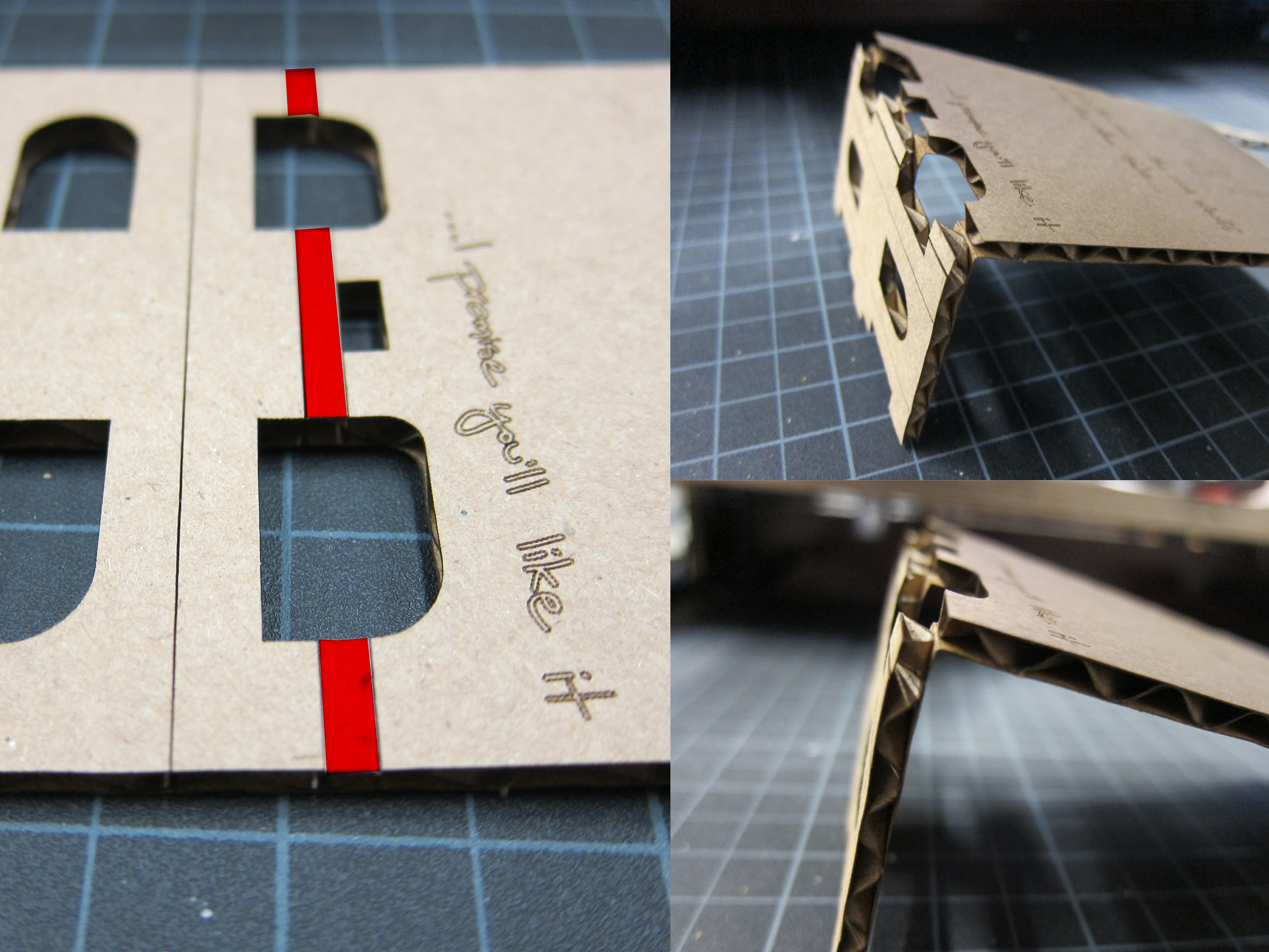 Why is this important? Especially since it is so obvious? Well the interesting thing about cardboard’s corrugations (and really all corrugations out there) is that if you don’t utilize them correctly your material can become very very weak. If we assume the corrugations of the cardboard in the image above are running one direction, then all the lines running left to right will be cut parallel to the corrugations (weak) while the line running up and down will result in perpendicular cuts (strong). Basically to sum that up, the cardboard is only strong in one direction, not both, like it needs to be. Also I said corrugations a lot.