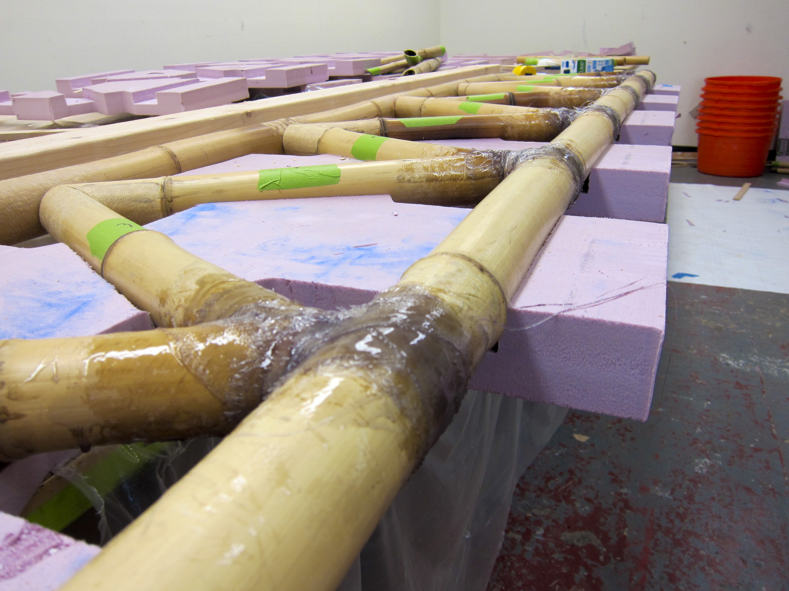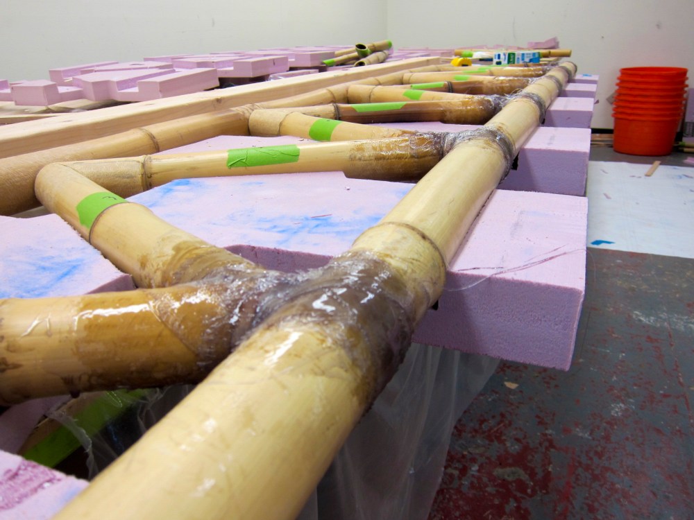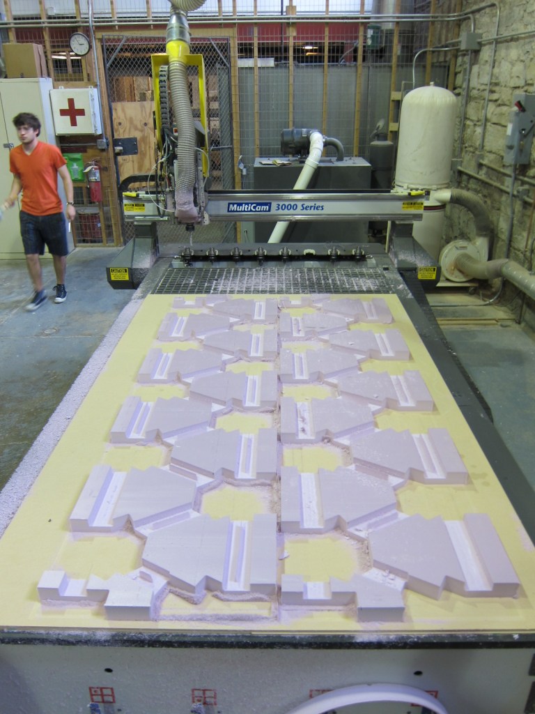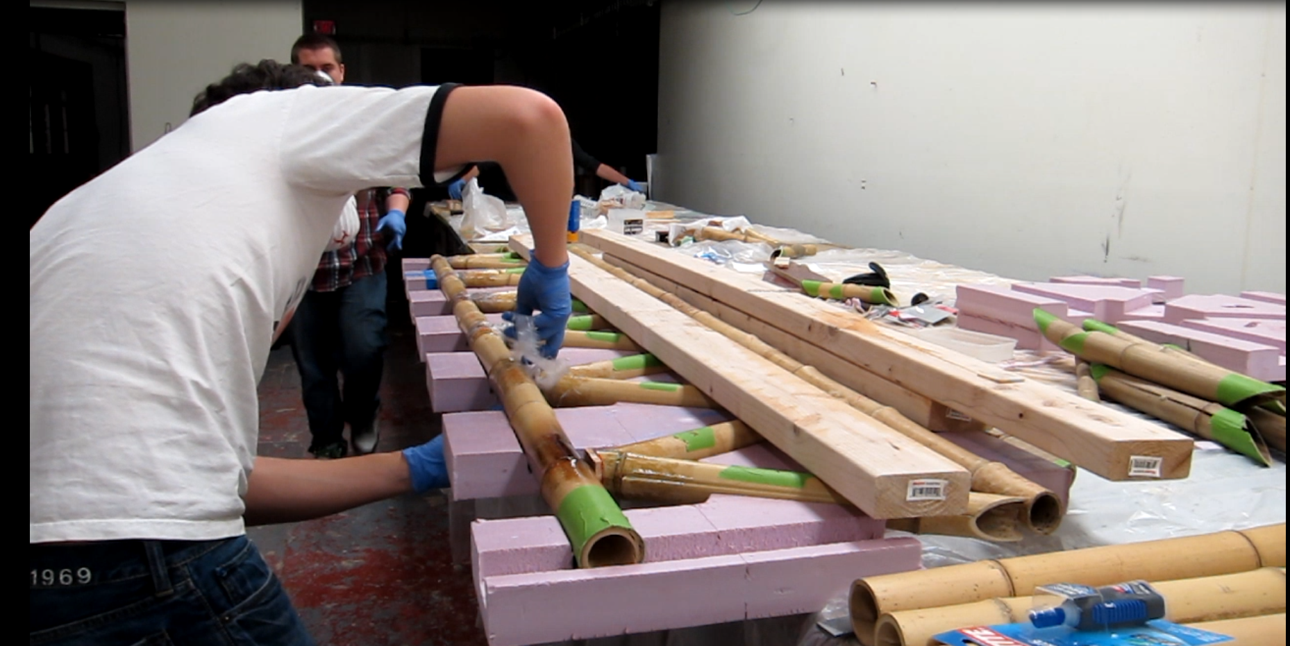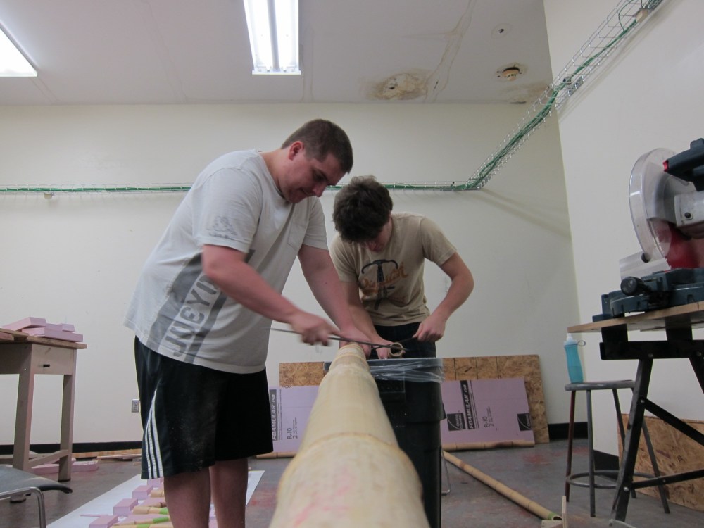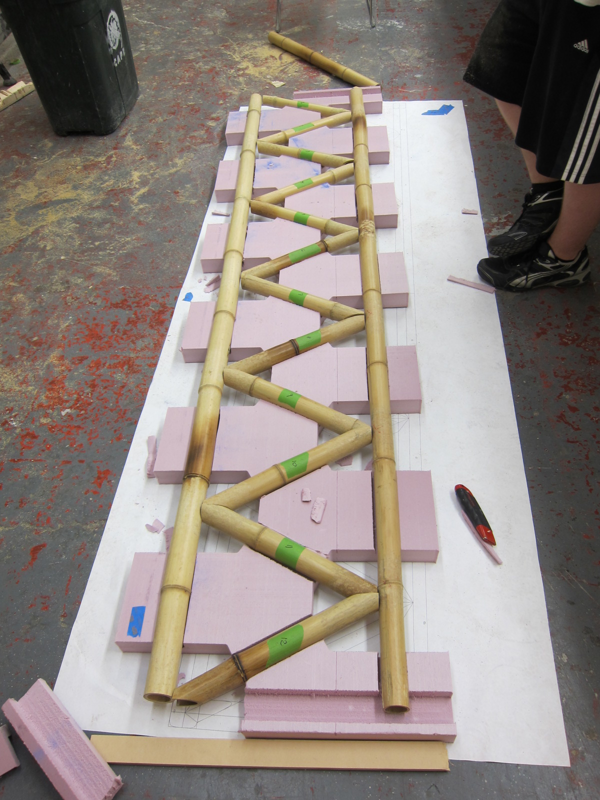 My two colleagues, Mr. Campbell and Mr. Bergstrom, and I decided that even though we had no prior experience to fiberglassing, we would give it a shot and build two full scale bamboo trusses to see if this idea was possible. So after ordering bamboo from San Diego I set about cutting the bamboo into the members we would need for the truss. Since the bamboo came in 8′ lengths we decided to make this our truss length and after calculating expected loads, settled on a depth of 18 inches. Using the CNC mill, we milled a jig out of rigid insulation that would hold the members in position as they were fiberglassed. Photo montage!