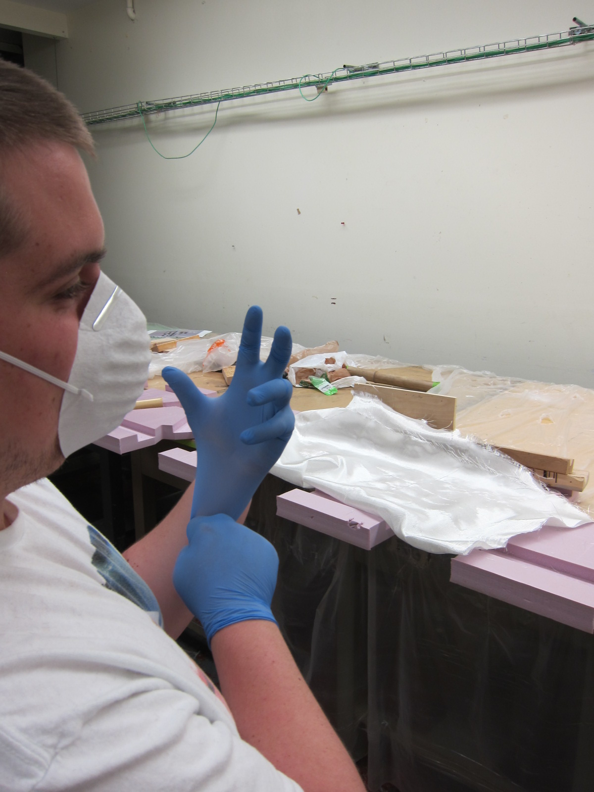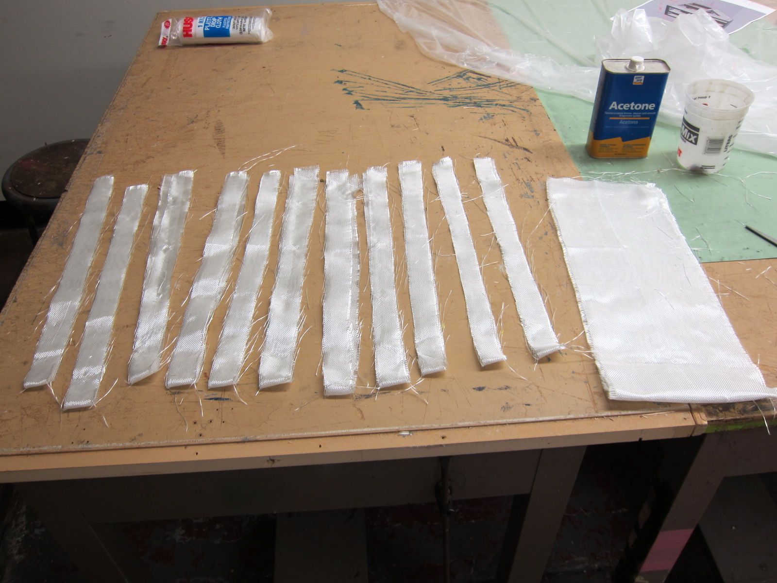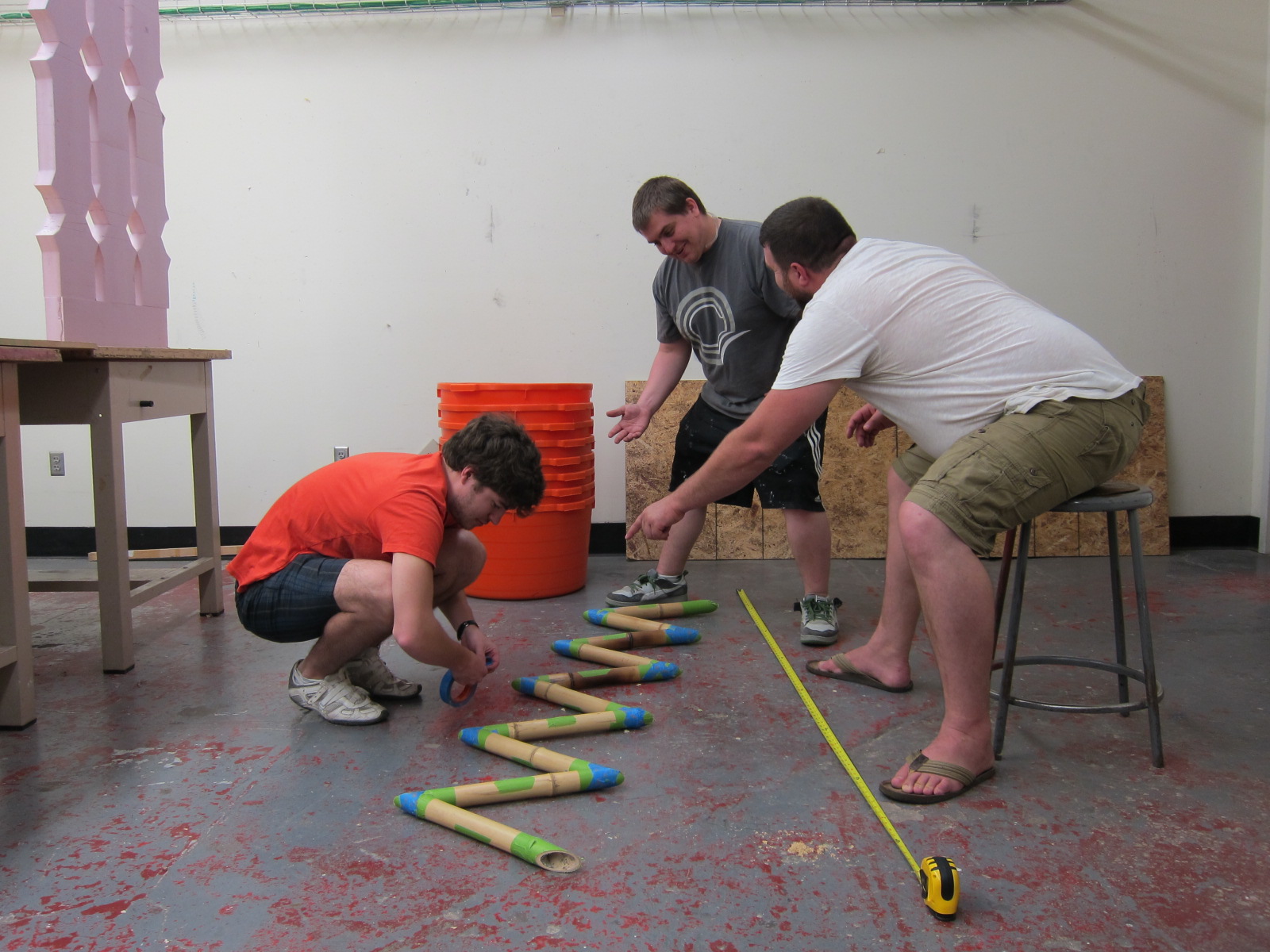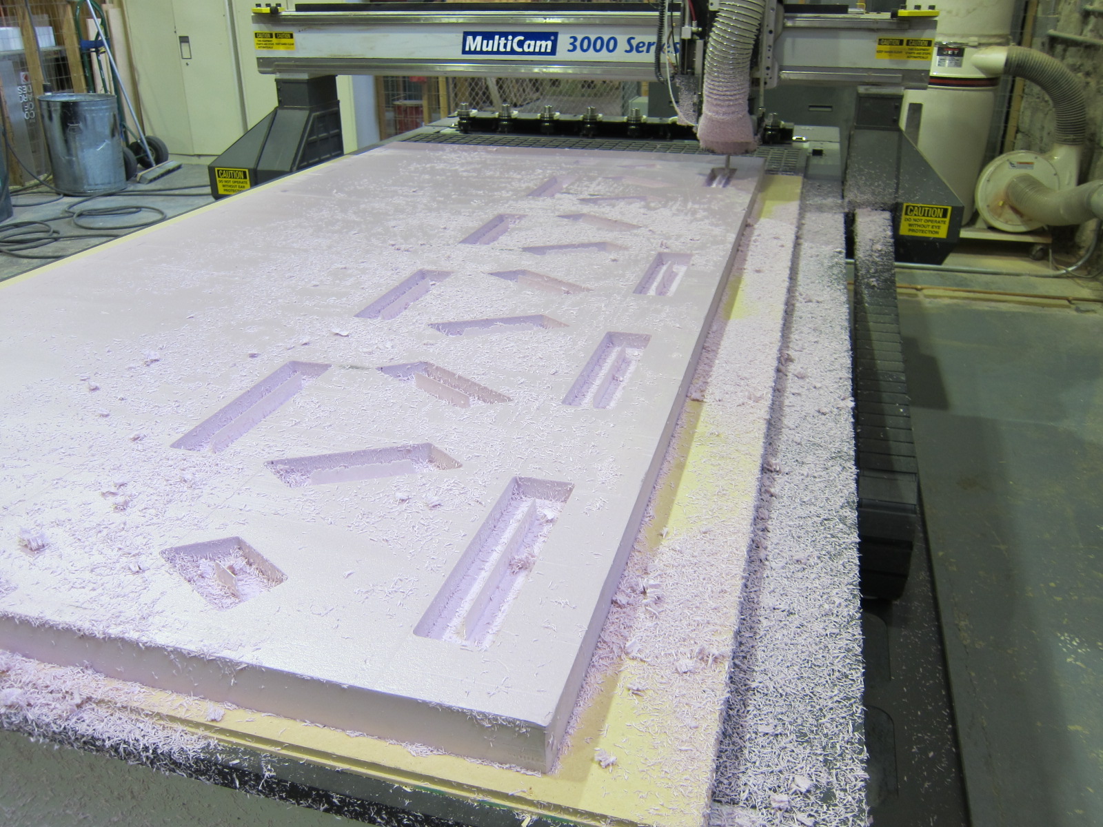 My two colleagues, Mr. Campbell and Mr. Bergstrom, and I decided that even though we had no prior experience to fiberglassing, we would give it a shot and build two full scale bamboo trusses to see if this idea was possible. So after ordering bamboo from San Diego I set about cutting the bamboo into the members we would need for the truss. Since the bamboo came in 8′ lengths we decided to make this our truss length and after calculating expected loads, settled on a depth of 18 inches. Using the CNC mill, we milled a jig out of rigid insulation that would hold the members in position as they were fiberglassed. Photo montage!