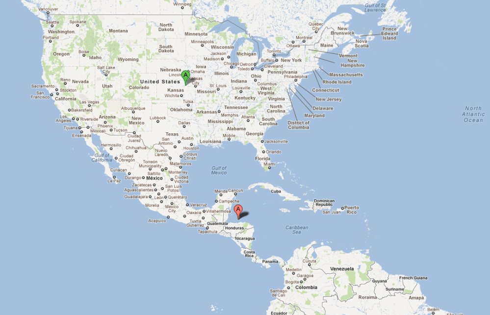 So I’m at the green dot and Roatan, Honduras is at the reddish dot. There’s A LOT of distance between us, and Google maps keeps refusing to give me driving directions there. Perhaps because Roatan is an island located off of the mainland of Honduras. Now how exactly does someone firmly rooted in the Midwest, amidst a sea of grass, find themselves working on an island project several thousand miles south?